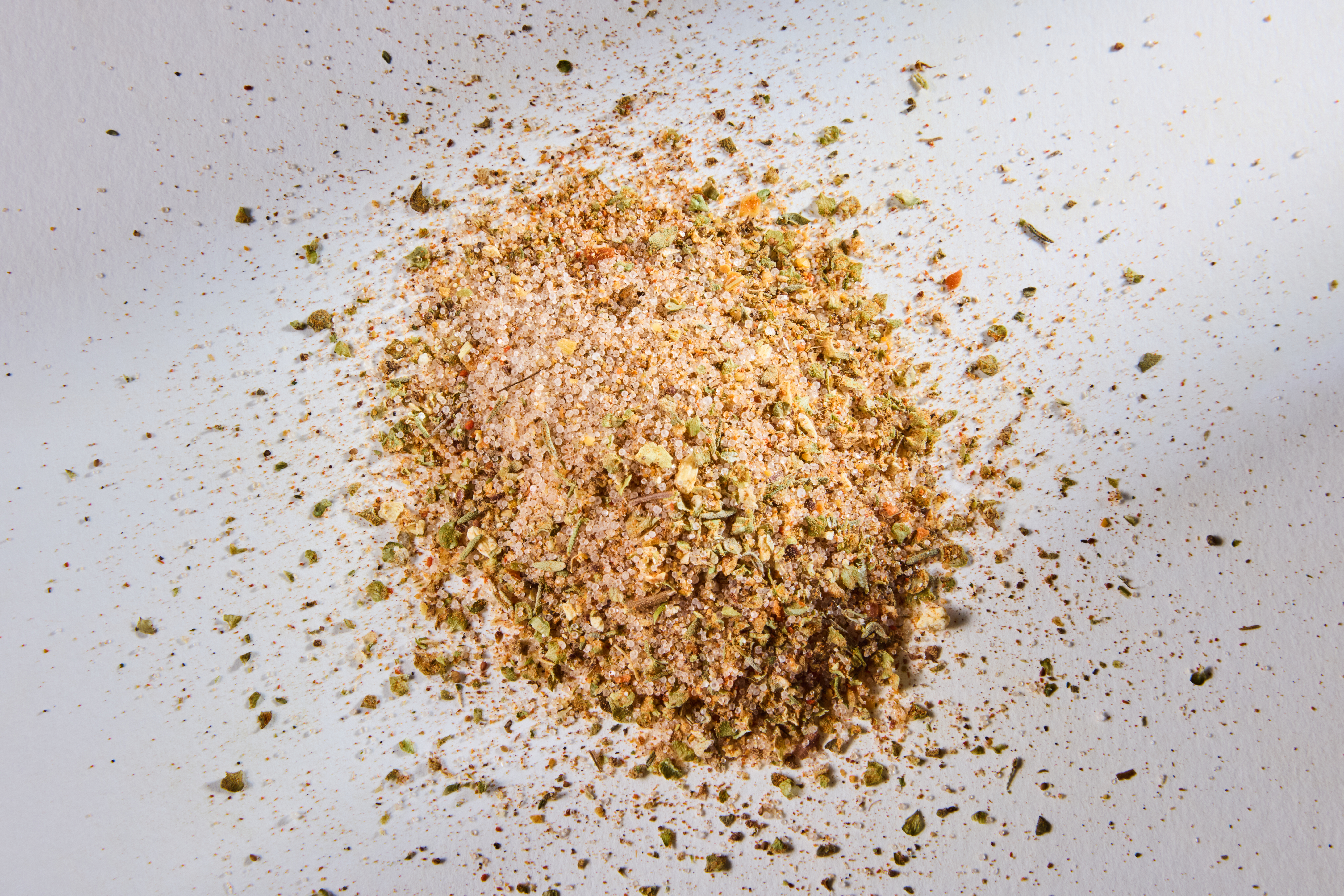 Salz, Paprika, Pfeffer Schwarz, Senfpulver, Sumach, Majoran, Thymian, Zwiebel, Speckpulver, Suppengemüse ( Karotte, Sellerie, Lauch) Wacholder, Loorbeer, Piment, Cayenne Pfeffer und geräucherte Paprika