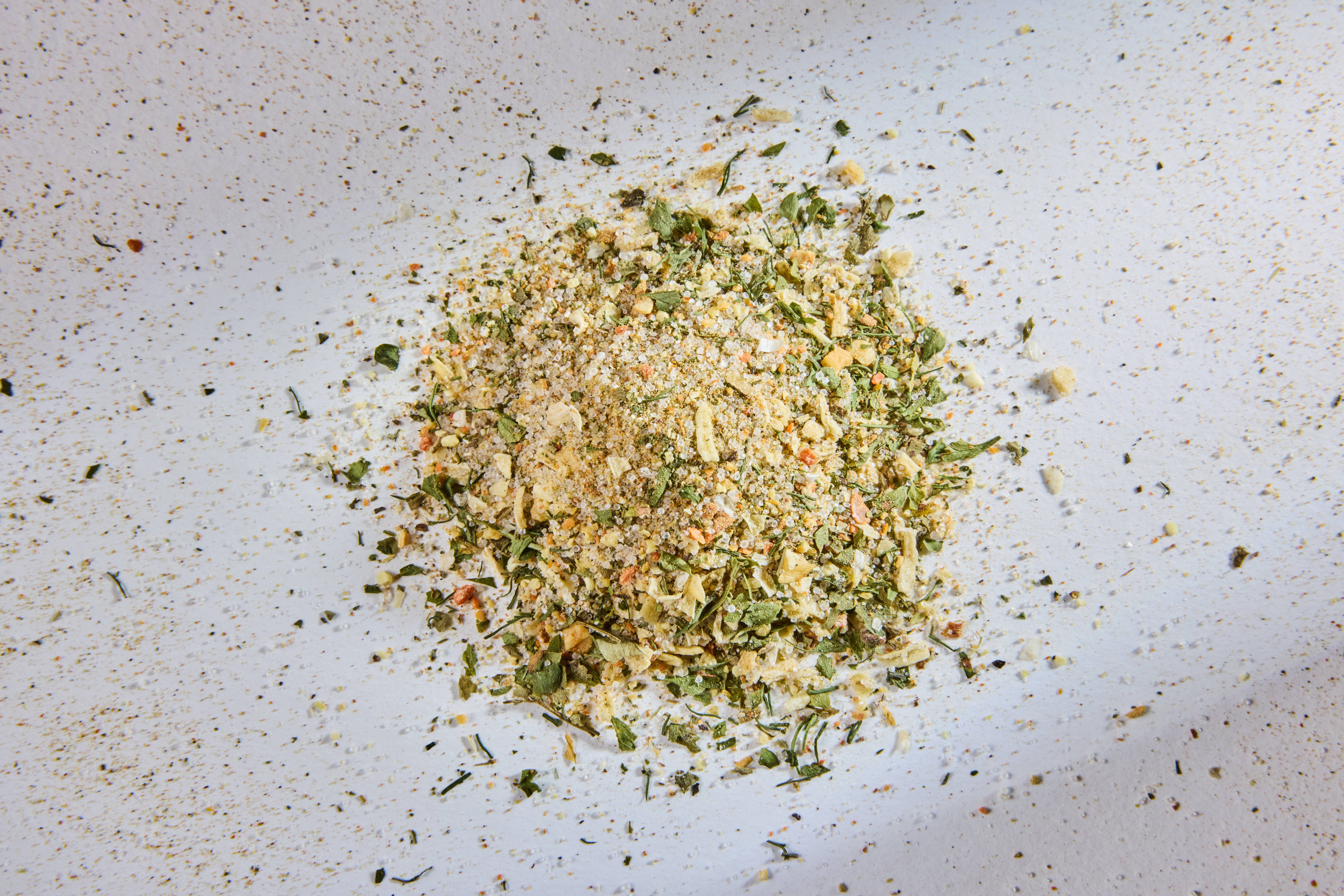 Gemüsebrühe (Karotten, SELLERIE, Lauch, Pfeffer, Muskat, Tomatenpulver, Knoblauch, Curcuma, Paprika, Rauchsalz, Salz, Steinpilzpulver, Bockshornklee, Sumach, SENFMEHL, 9 erlei Kräuter), Dill, Knoblauch, Zwiebel, Pfeffer, Petersilie, Cayenne-Pfeffer, Liebstöckel und Chili gerebelt